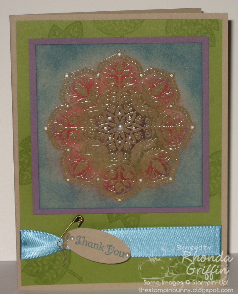 First is the Out of the Box and Crayon Resist card shown below. I think you will enjoy how easy the rectangle brocade stamp in the new Clearly for You set makes the Out of the Box technique incredibly simply to do!  You'll just have to take my word for it until you see it in person that the white border around the image really makes it "pop".